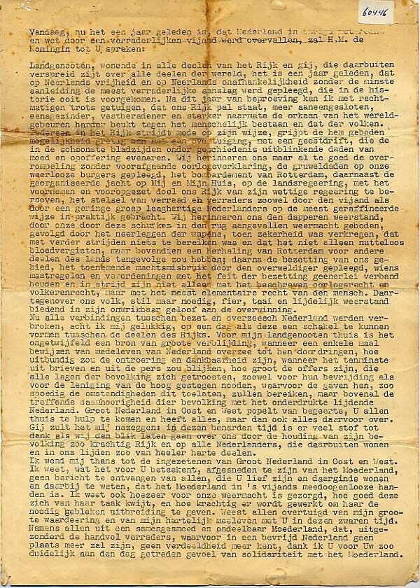 Stencil met de tekst van de rede van koningin Wilhelmina ter gelegenheid van de herdenking van het eerste bezettingsjaar, uitgesproken op 10 mei 1941.