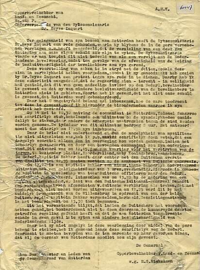 Stencil met de tekst van een brief waarin generaal Winkelman reageert op een uitspraak van Seyss Inquart dat Nederland het bombardement op Rotterdam aan zichzelf te wijten zou hebben.