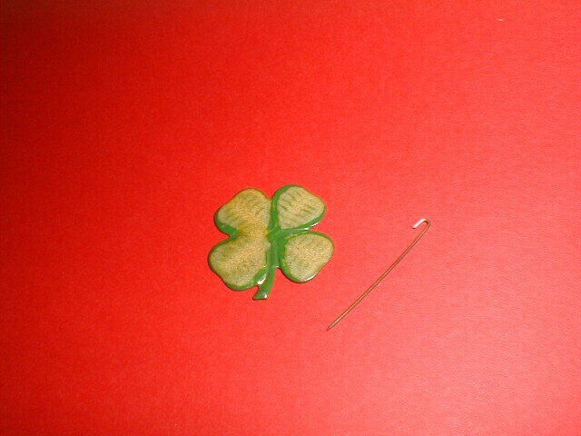 Een groen en geel gekleurd metalen speldje in de vorm van een klavertje vier. Dit soort speldjes werd vermoedelijk door een collectant van de Winterhulp Nederland gedragen.