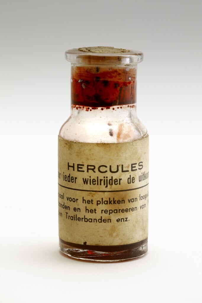 Een flesje met een kurken stop voor 'Hercules surrogaatolie. Voor iedere wielrijder de uitkomst'.