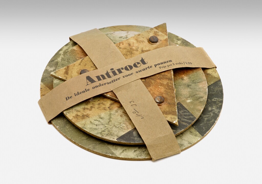 Twee ronde onderzetters en een driehoekige. Alle met metalen knoppen. Ze zijn opgeborgen in een papieren houder met daarop: "Antiroet. De ideale onderzetter voor zwarte pannen. Prijs per 3 stuks F 1,75".