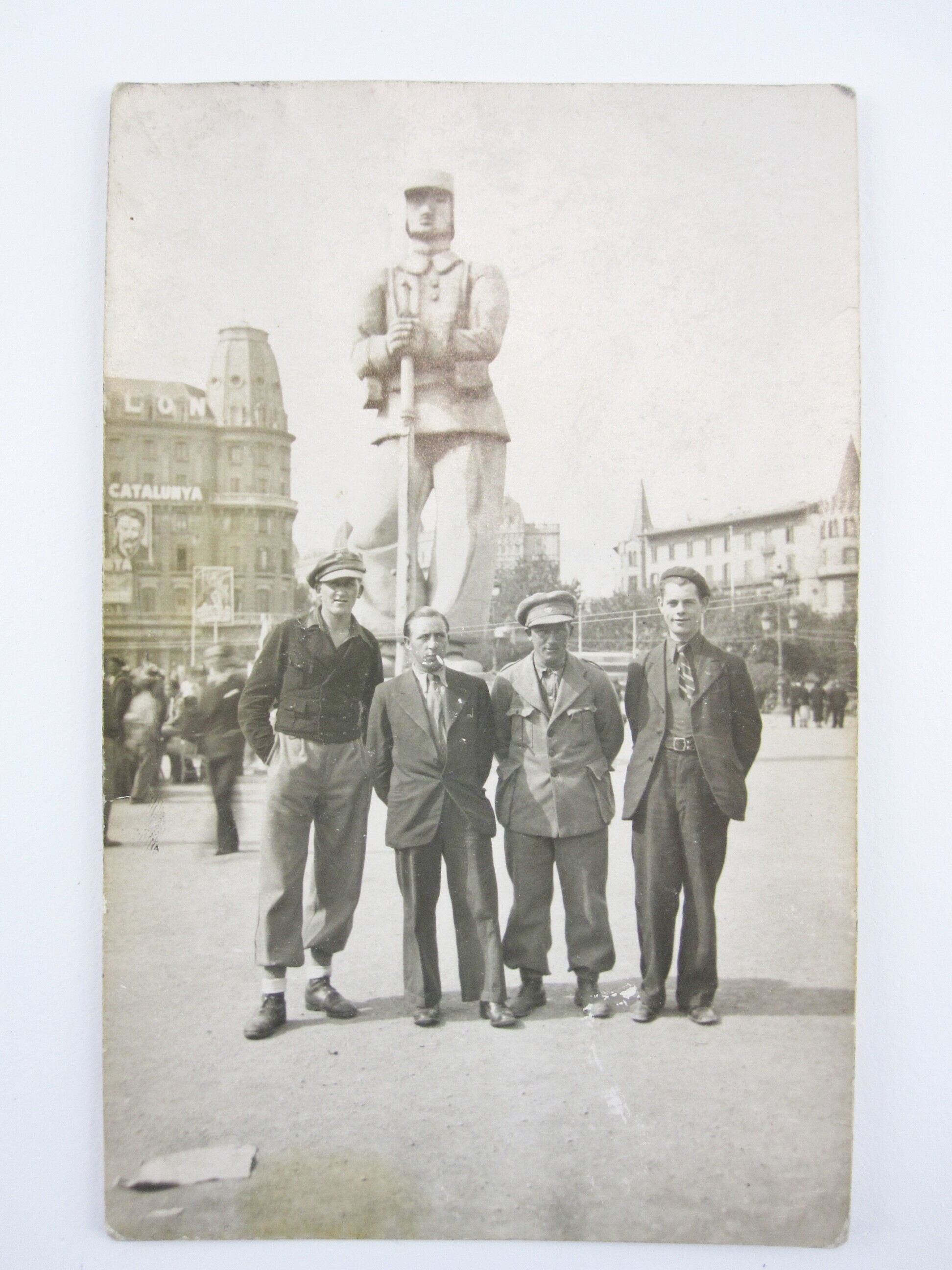Een zwart-wit foto van Albert Ditz met drie medestrijders in de Spaanse burgeroorlog, genomen op de Plaza Catalunya in Barcelona met op de achtergrond een standbeeld van een militair.