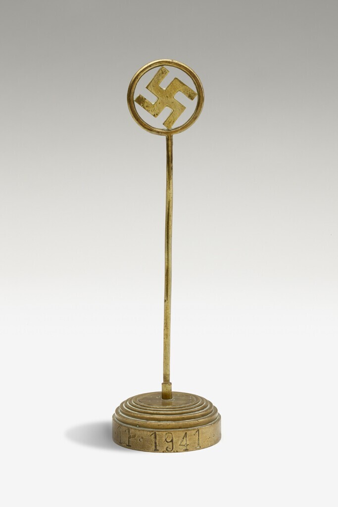 Koperen standaard voor een vaantje met bovenin een opengewerkt hakenkruis in een cirkel. Bovenop het voetstuk de letters "XX" en "EF" en aan de zijkant: "Zofilli Nello 20-11-1941". Onderop de plaatsnamen Rimini en Berlijn. Mogelijk is de standaard afkomstig van een Italiaanse(?) dienstauto, die in maart 1945 bij een luchtaanval getroffen werd in de omgeving van het stadsdeel Brackwede van de stad Bielefeld in Noordrijn-Westfalen.