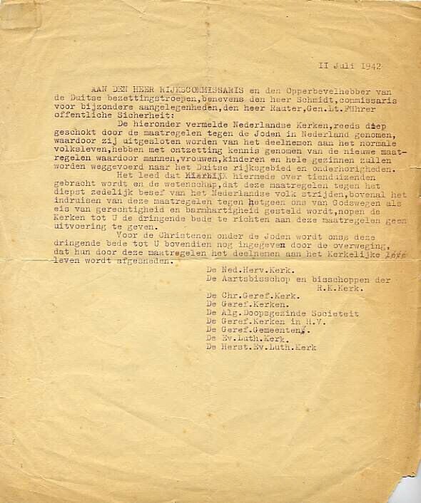 Een brief uit naam van Nederlandse kerken gericht aan rijkscommissaris Seyss-Inquart tegen de Jodenvervolging, waarin onder meer staat dat er "met ontzetting kennis (is) genomen van de nieuwe maatregelen waardoor mannen, vrouwen, kinderen en hele gezinnen zullen worden weggevoerd naar het Duitse rijksgebied en onderhorigheden." Onderaan de brief de namen van verschillende kerkgenootschappen.