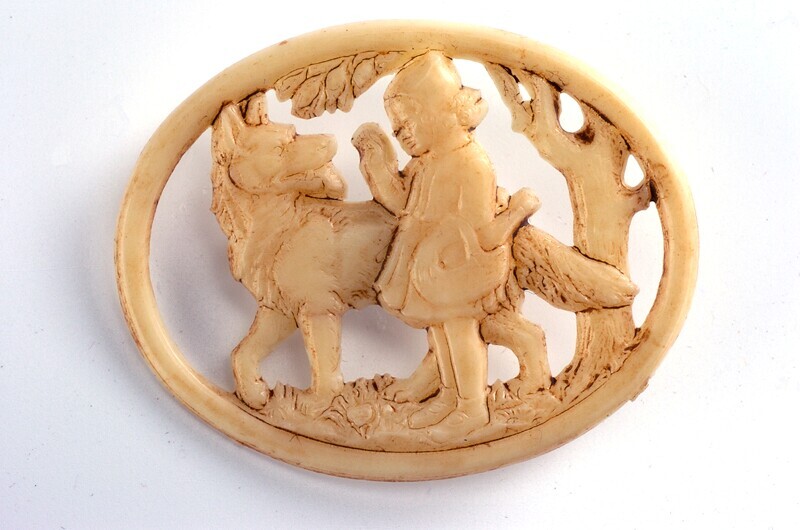 Serie van acht verschillende collectespeldjes van de Winterhulp Nederland gemaakt van cremekleurig kunststof, rechthoekig of ovaal van vorm. Sprookjesvoorstellingen: Doornroosje, Roodkapje, Sneeuwwitje, Assepoester, de Gelaarsde kat, Hans en Grietje, Klein duimpje, De wolf en de zeven geitjes.