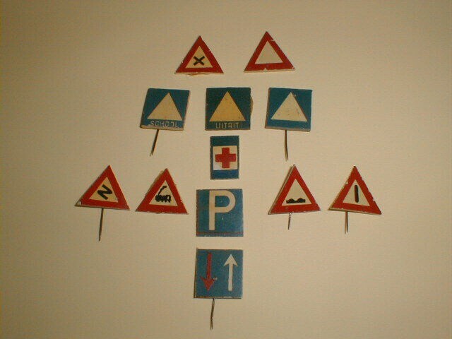 Serie van twaalf verschillende collectespeldjes van de Winterhulp Nederland gemaakt van kunststof met verkeersborden als onderwerp: onbewaakte overweg, s-bocht, nadering voorrangsweg, uitholling overdwars, gevaarlijke kruising, attentieteken, school, uitrit, parkeren, Rode Kruis, tegenligger heeft voorrang, witte driehoek in blauw vierkant vlak. Uitgereikt tijdens de collecte van 23 en 24 januari 1942