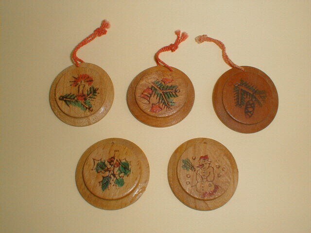 Serie van vijf verschillende ronde houten collectespeldjes van Winterhulp Nederland met voorstellingen gerelateerd aan het kerstfeest: takje hulst, sneeuwpop, dennentak met klok en sterren, dennentak met kaars, dennentak met dennenappel. Uitgereikt tijdens de collecte op 22 en 23 december 1941.