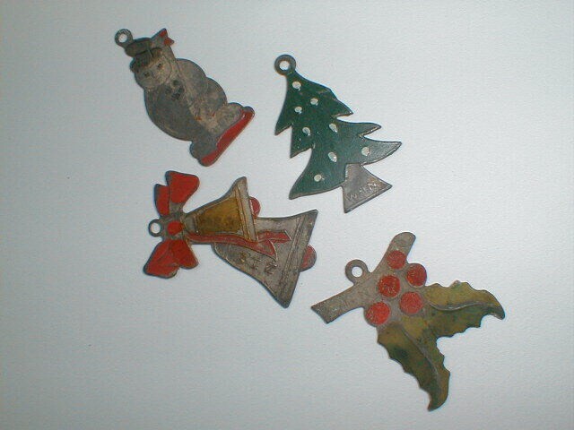 Serie van vier verschillende gekleurde metalen speldjes met voorstellingen gerelateerd aan het kerstfeest: sneeuwpop, kerstboom, hulsttak en kerstklokken. Uitgereikt bij de collecte op 22 en 23 december 1942.