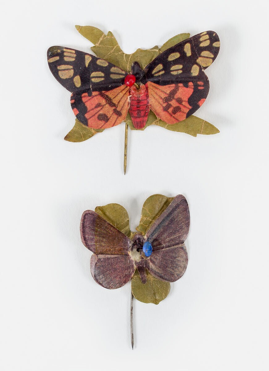 Twee speldjes van waspapier uit een serie met voorstellingen van vlinders. Uitgereikt tijdens de collecte tussen 2 en 4 oktober 1943.
