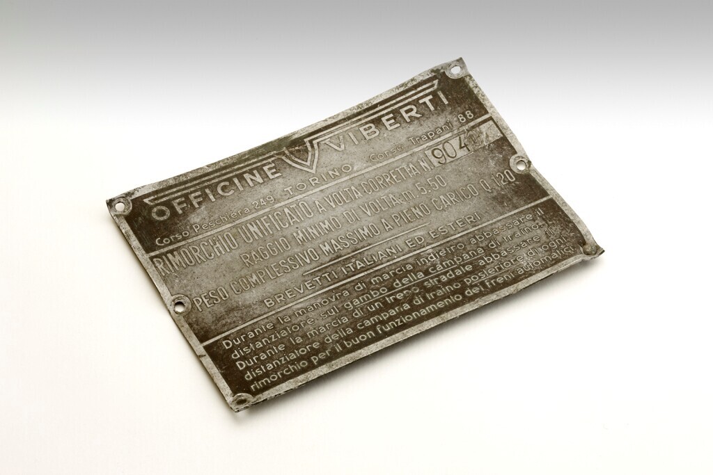 Een zwart geverfd aluminium bordje afkomstig uit Italiaanse auto van legeronderdeel te Hoorn met aanwijzingen in het Italiaans.