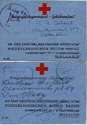 Een blauw kaartje, geadresseerd aan het Nederlandse Rode Kruis, waarmee een krijgsgevangene de ontvangst van een levensmiddelenpakket kon bevestigen Twee exemplaren: een gedateerd 31 oktober 1943 en bestemd voor H. van Hest in Den Haag, het andere gedateerd 20 februari 1944 en bestemd voor Ch. A. Cacheret te Rotterdam.