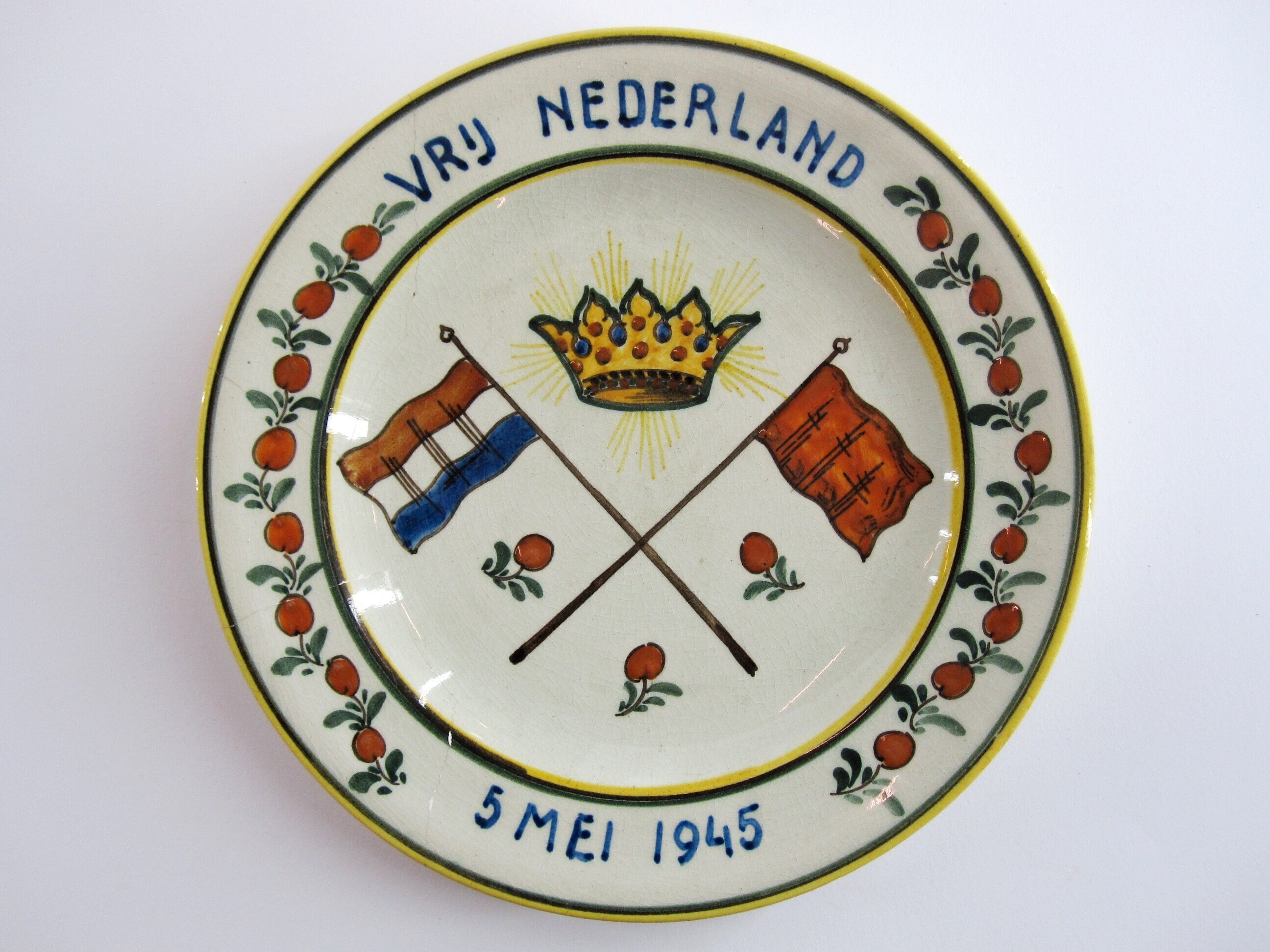 Een gedenkbord met op de rand bovenaan: "Vrij Nederland" en onderaan: "5 Mei 1945". Hiertussen een versiering met 'appeltjes van Oranje'. In het midden de afbeelding van een kroon boven de kruislings aangebrachte vlaggen van Nederland en van het Oranje Huis. Tussen de stokken van deze vlaggen zijn drie afzonderlijke 'appeltjes van Oranje' weergegeven. Op de onderkant het logo van de "N.V. Koninklijke Plateelbakkerij Zuid-Holland Gouda" met de tekst: "Gouda Holland 3" en een merkteken. Hierboven zijn twee gaten aangebracht waardoor een metaaldraad is gestoken voor het ophangen aan een wand.