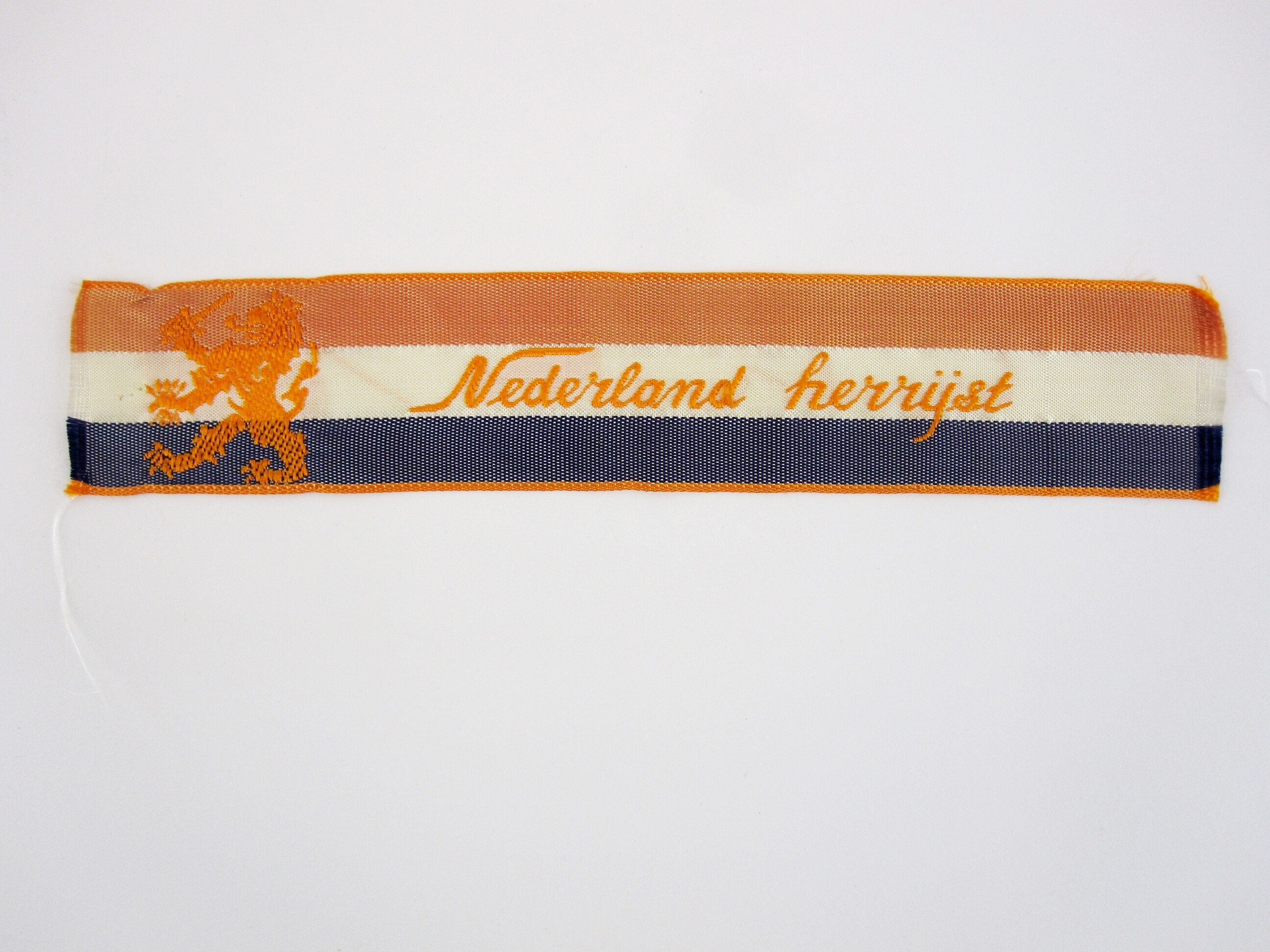 Een kunstzijden lint met onafgewerkte zijkanten in de kleuren oranje, wit en blauw. Op de linkerkant is de afbeelding van de Nederlandse leeuw met oranje garen geborduurd en rechts daarvan eveneens met oranje garen: "Nederland herrijst".