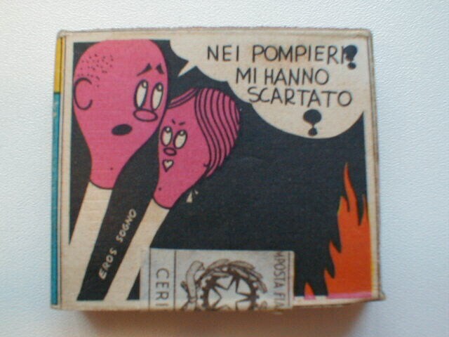Hoesje van een Italiaans luciferdoosje met op beide kanten een cartoon waarin een toespeling gemaakt wordt op de V2 raketten. Op een cartoon zijn een mannelijke en een vrouwelijke lucifer afgebeeld vlak bij een vlam. In tekstballon bij de eerste: "Nei pompier? Mi hanno scartato!". Tussen beide lucifers: Eros Sogno.