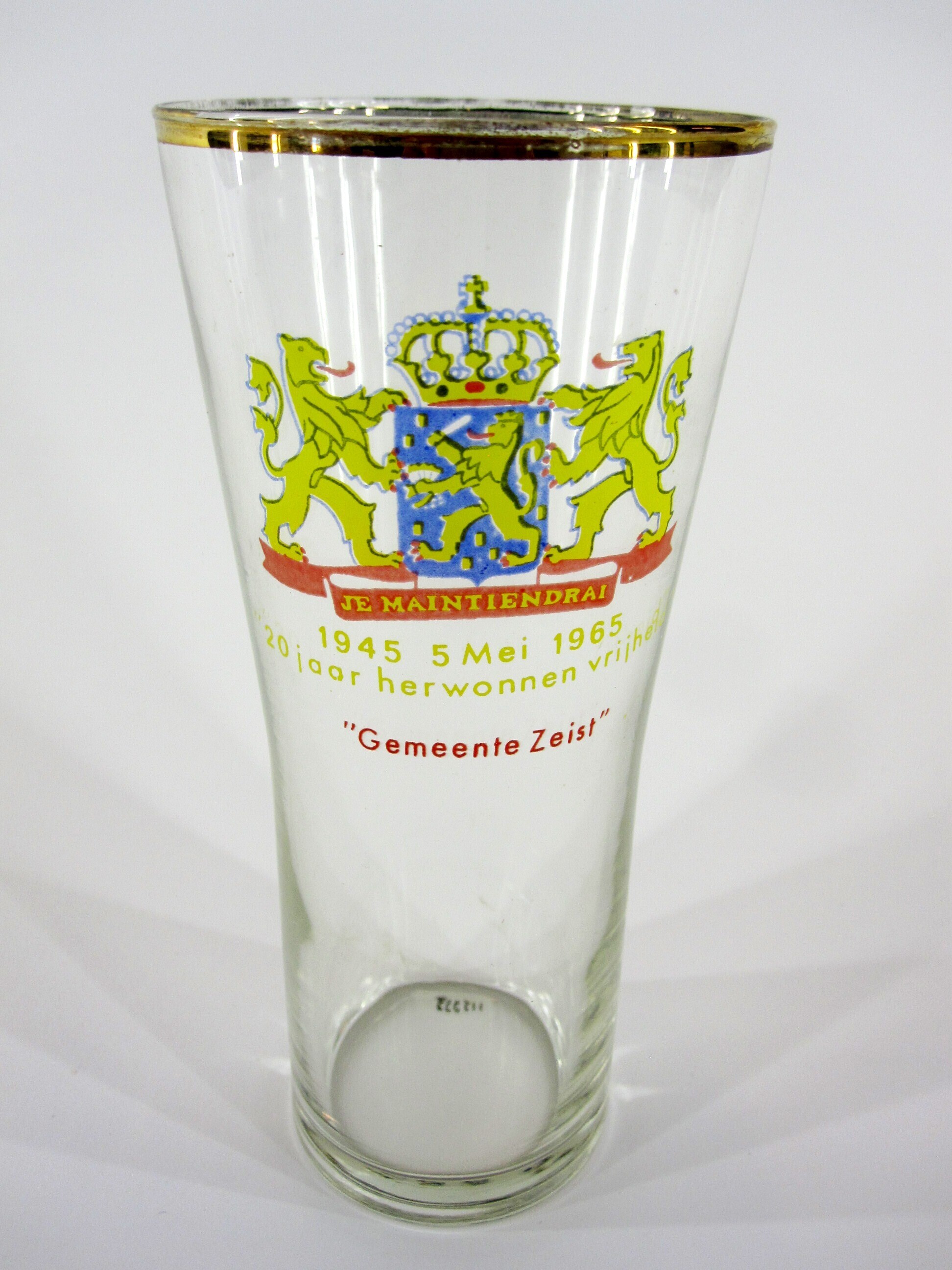 Een bierglas gemaakt ter gelegenheid van de 20-jarige herdenking van de bevrijding. In de kleuren geel, oranje en blauw is op het glas het wapen van Nederland aangebracht met daaronder: "Je maintiendrai" en daaronder: "1945 5 mei 1965 20 jaar herwonnen vrijheid" en "Gemeente Zeist”. Het glas heeft een gouden randje. Het bierglas is opgeborgen in het originele geschenkdoosje.