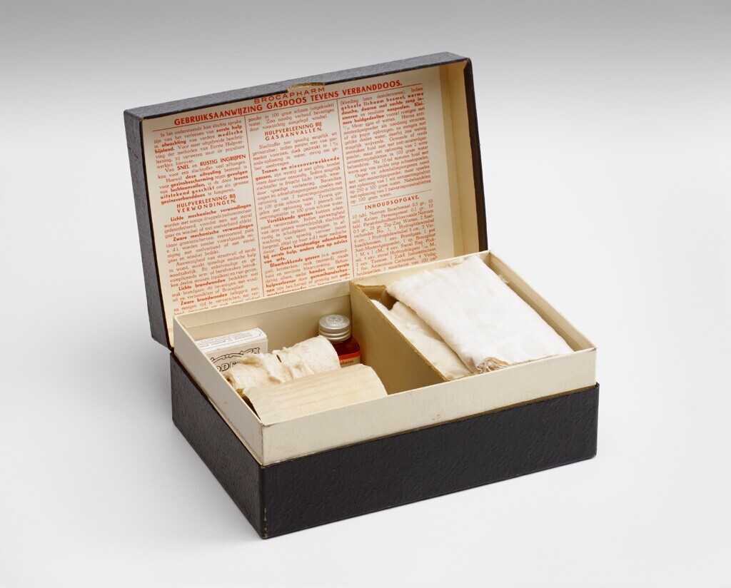 Zwart kartonnen gasdoos, tevens verbanddoos voor Eerste Hulp bij Gasaanvallen. Het deksel kan scharnieren. Op het deksel een lichtblauw etiket met de firmanaam: een klein driehoekig logo met: "K P F". Daaronder: "Brocapharm, gasdoos tevens verbanddoos". Links boven een klein groen etiketje van de drogisterij waar de doos is gekocht: "De Vijzel. Groot Hertoginnelaan Den Haag". Op de binnenkant van het deksel een rood gedrukte handleiding. De doos is met een kartonnen tussenschotje in tweeën verdeeld. In het rechter vakje is rechts een verhoging aangebracht. De doos bevat twaalf onderdelen. <br>