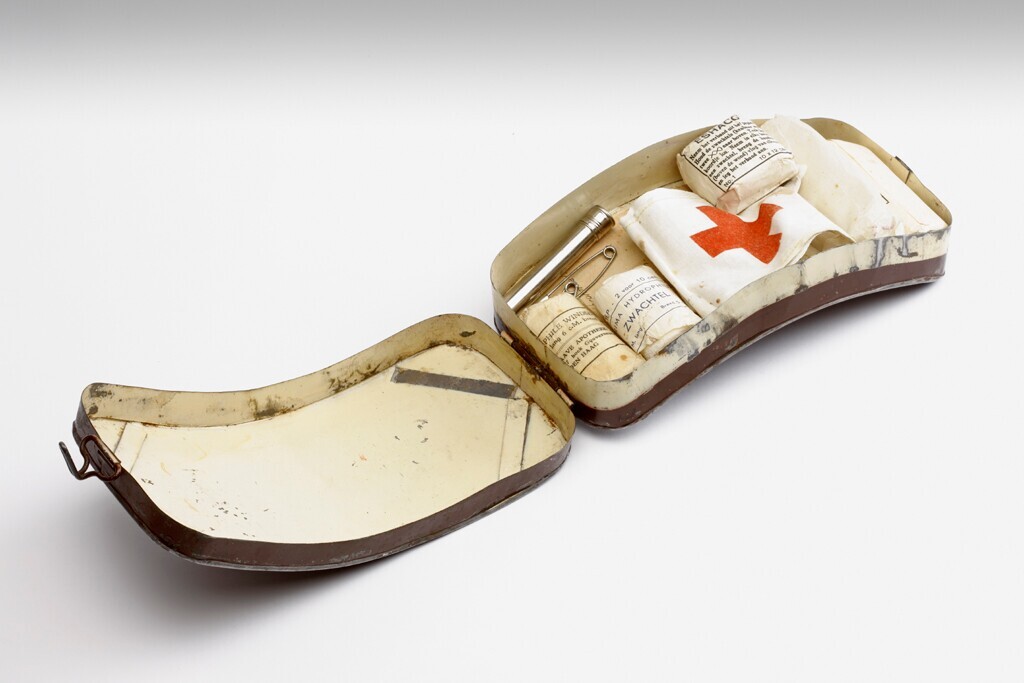 Een donkerrode metalen verbanddoos. De doos heeft een in de lengte lopende gekromde vorm en kan over de breedte scharnieren worden geopend met rechts een over de bodem klappende beugelsluiting. Op het deksel in rood geverfd: "Sector IV b" en "Wijk 3". Hiertussen een groen kruis en daaromheen in wit: "E.H.B.O." De binnenkant is beige met in het deksel nog aanwezig in drie hoeken metalen verstevigingstrippen. De doos bevat een wit katoenen mouwband met een rood kruis en verschillende verbandmaterialen en een inhoudsbeschrijving.