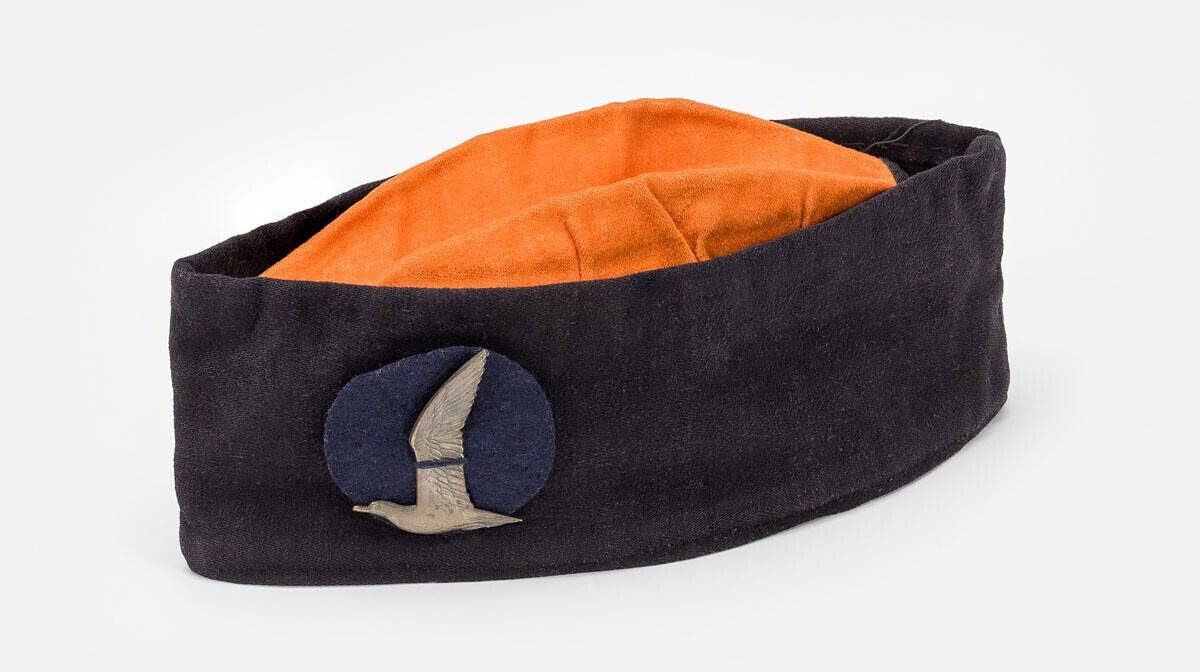 Een zwarte kwartiermuts van de Nationale Jeugdstorm met oranje bovenkant. Op de muts is het logo van de Nationale Jeugdstorm aangebracht in de vorm van een metalen vliegende meeuw op rond donkerblauwe vilten achtergrond. Aan de binnenkant met blauw borduurgaren: "A TH. H'LEM".