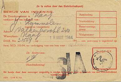 Bewijs van aanvraag voor het verkrijgen van een bon voor schoenen, uitgegeven door de Distributiedienst Den Haag.