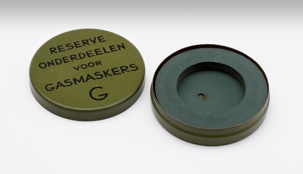 Legergroen gekleurd rond blikje waarop in zwart: "Reserve onderdeelen voor gasmaskers", daaronder een 'G'. In het blikje een rubberen ring en twee rubberen schijfjes met een klein gaatje.