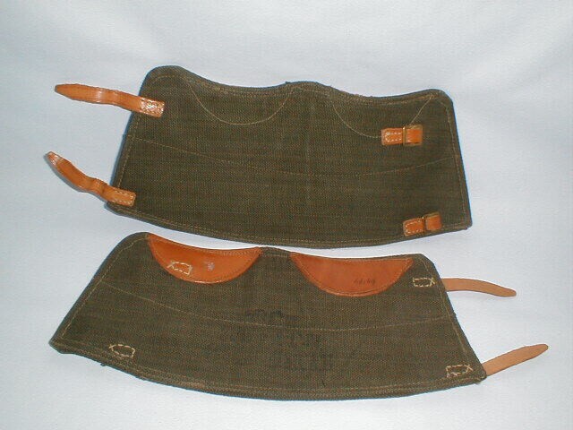 Een paar legergroene canvas enkelstukken van Britse makelij. Bij het hielgedeelte zijn twee sikkelvormige stukken leer ter versteviging aangebracht. Aan de achterzijde twee leren riempjes voor de bevestiging.