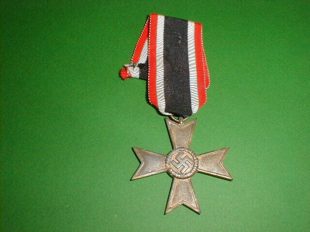 Een Duitse militaire onderscheiding in de vorm van een koperkleurige kruisvormige medaille: Kriegsverdienstkreuz, Klasse I. Aan de voorkant in het midden het Hakenkruis aan de achterzijde het jaartal 1939. De onderscheiding werd door Adolf Hitler op 18 december 1939 ingesteld ter erkenning van bijzondere verdiensten in de oorlog die echter niet met het IJzeren Kruis konden worden beloond.