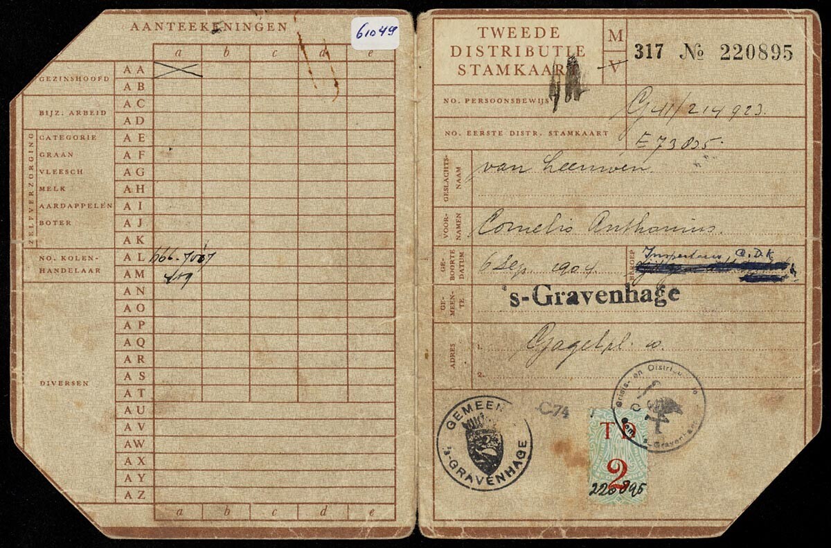 Een "Tweede Distributie Stamkaart" met het nummer 220895 op naam van Cornelis Anthonius van Leeuwen,...
