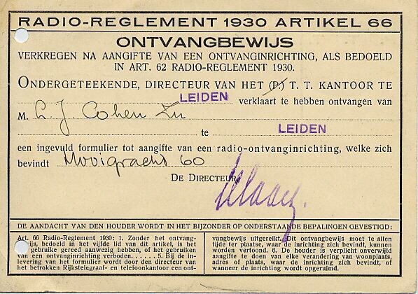 Ontvangstbewijs ter bevestiging van de registratie van een radio te Leiden op naam van L.J. Cohen.