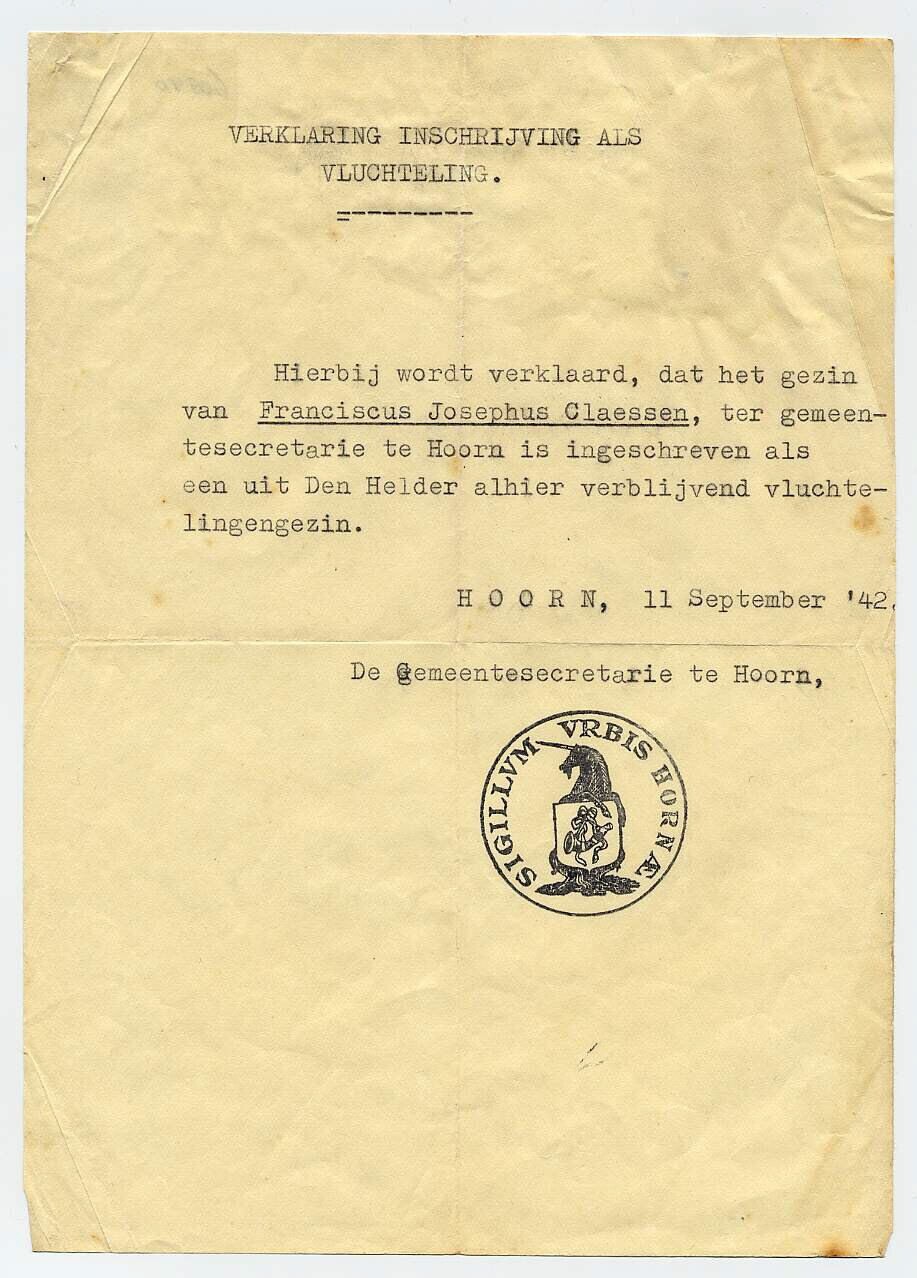 Document met de tekst: "Hierbij wordt verklaard, dat het gezin van Franciscus Josephus Claessen, ter gemeentesecretarie te Hoorn is ingeschreven als een uit Den Helder alhier verblijvend vluchtelingengezin". Met stempel van de gemeente Hoorn.