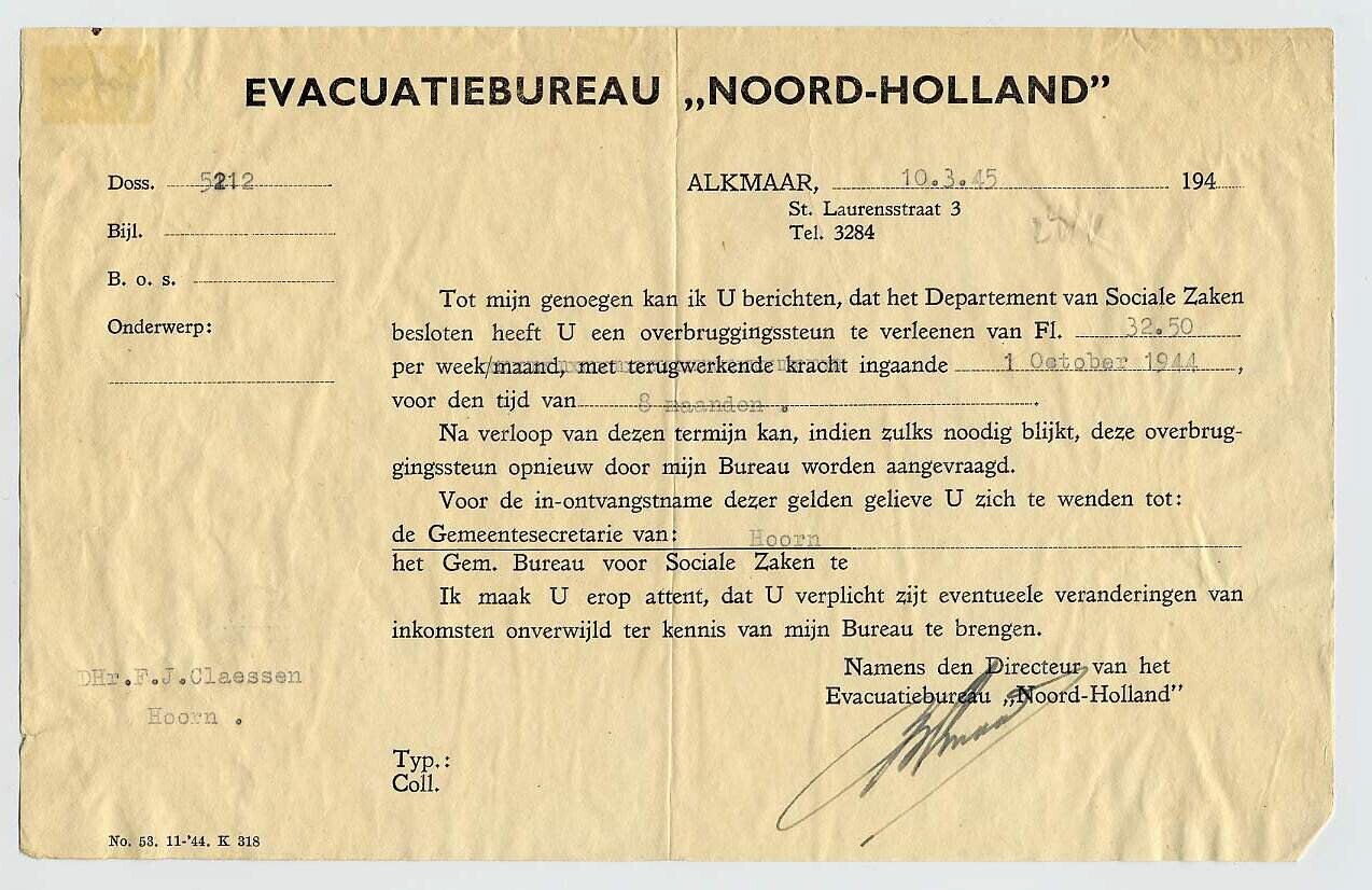 Een gedrukt blanco formulier van het evacuatiebureau noord-Holland met op het voorblad ruimte voor naam, geboortedata, geslacht, nationaliteit en woonplaats voor een geavacueerd gezin. Aan de binnenkant is er plaats voor informatie over huisvesting, gezondheid en de financiële situatie.