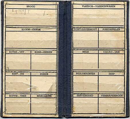 Mapje van grijs papier voor het opbergen van distributiebonnen. Het mapje is open te klappen. Binnenin vakjes van doorzichtig kunststof met boven elk vakje de aanduiding van de voedingswaren waarvoor de bonnen zijn bedoeld.