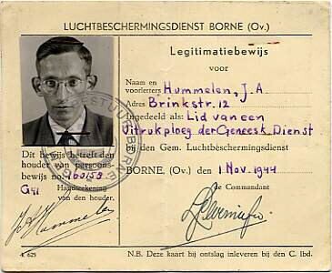 Legitimatiebewijs met pasfoto van de heer J.A. Hummelen van de luchtbeschermingsdienst Borne afgegeven te Borne op 1 november 1944..
