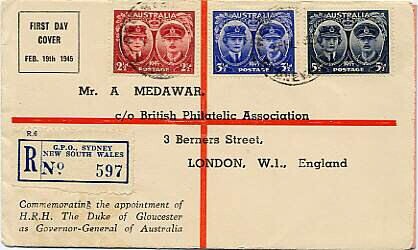 Eerstedag enveloppe ter herinnering aan de benoeming van de hertog van Gloucester tot gouverneur van Australië. De brief is van Sidney naar Londen gezonden.