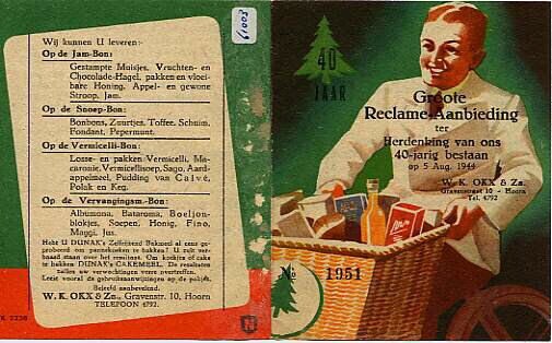 Reclamefolder in kleurendruk van een kruideniersbedrijf ter gelegenheid van het 40-jarig bestaan. Op de voorzijde een man met boodschappenmand op de fiets, aan de achterzijde producten op de bon.