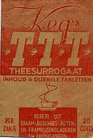 Bruine papieren verpakking voor zes tabletten theesurrogaat. Op de achterzijde is de gebruiksaanwijzing gedrukt.