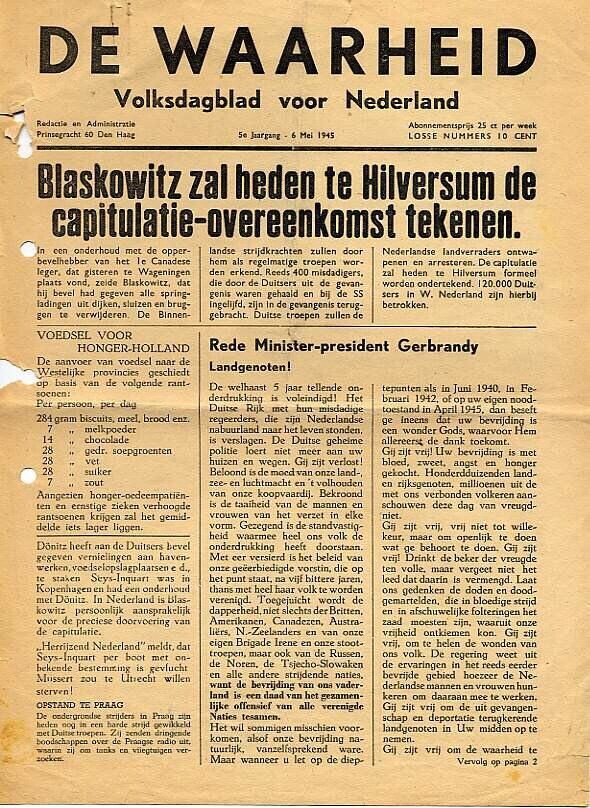 Een twee bladzijden tellende uitgave van "De Waarheid, Volksdagblad voor Nederland" vijfde jaargang van 6 mei 1945. Blaskowitz.