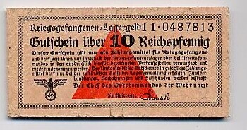 Biljet met Duitse tekst in gotische letters met in het midden een rode driehoek en links onder de Duitse Rijksadelaar met hakenkruis. Het biljet werd gebruikt in krijgsgevangenenkampen.