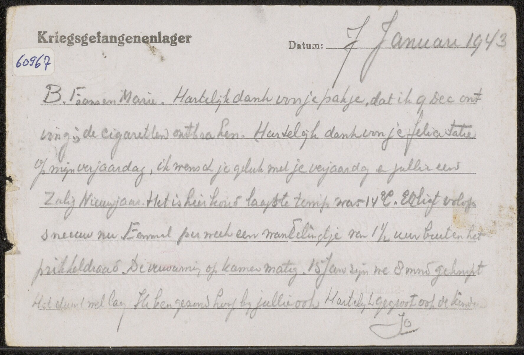 Briefkaart van J.A. Claessen, M-Stammlager 371, Stanislaus/Galizien, aan de familie Claessen in Hoorn, gedateerd 7 januari 1943. Onderwerpen: verjaardag, de kou, eens per week wandeling van anderhalf uur buiten het prikkeldraad, gezondheid. Op de kaart een stempel: "Stalag 371 geprüÂft 1".