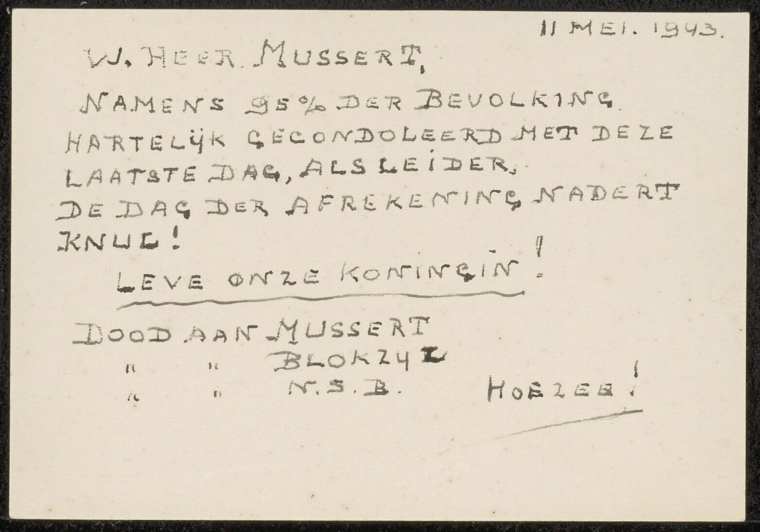 Een met pen geschreven brief met de tekst:<br>'W. Heer Mussert 11 mei 1943.<br>Namens 95% der bevolking hartelijk gecondoleerd met deze laatste dag, als leider, de dag der afrekening nadert knul! Leve onze koningin! <br>Dood aan Mussert<br> " " Blokzijl<br> " " N.S.B. <br>Hoezee!' <br>