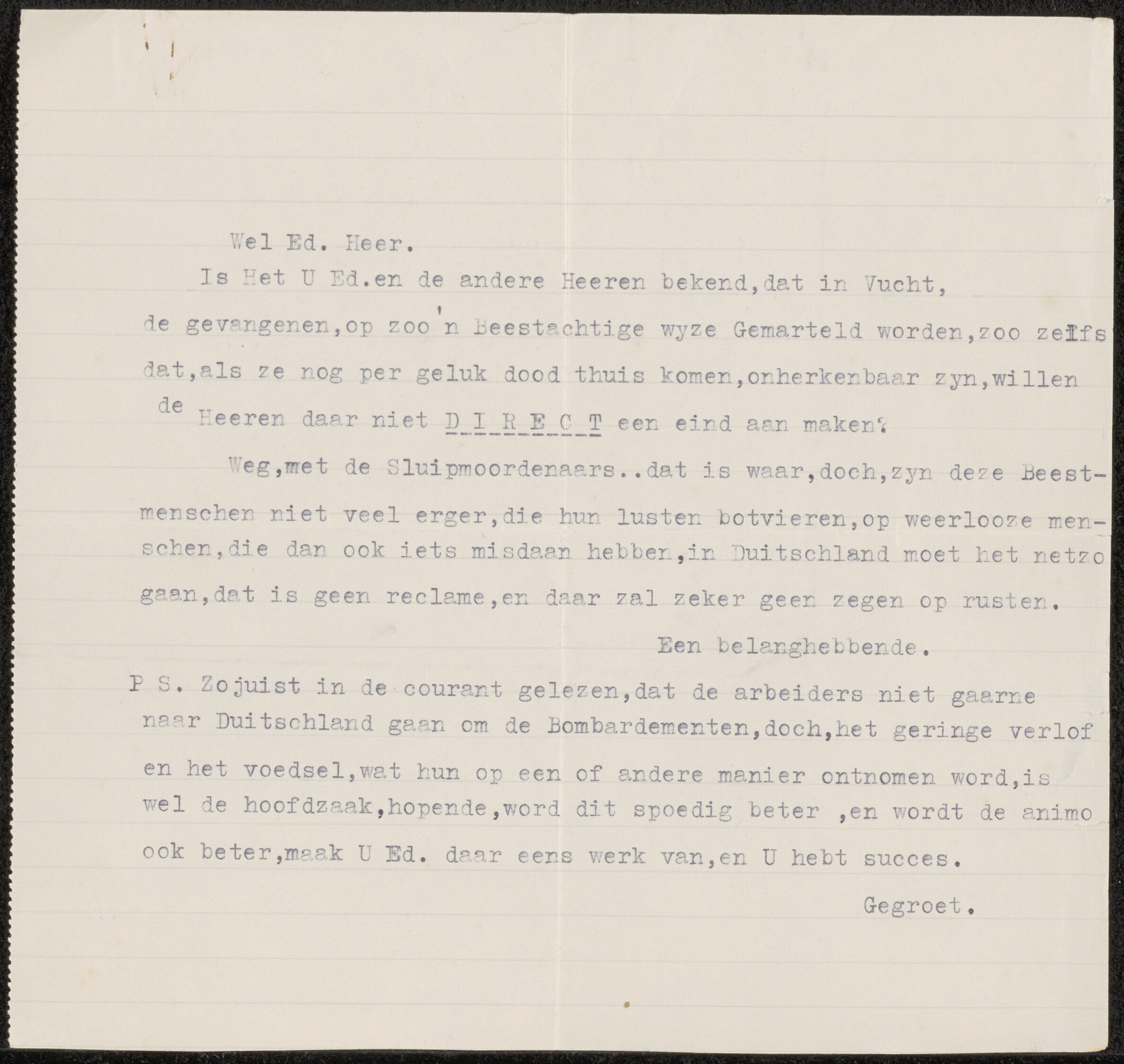 Getypte brief met enveloppe gericht aan Mussert. In de brief wordt onder andere aan Mussert gevraagd om direct een eind te maken aan de beestachtige martelingen in Vugt. Poststempel: 1943, Eibergen.<br><br>