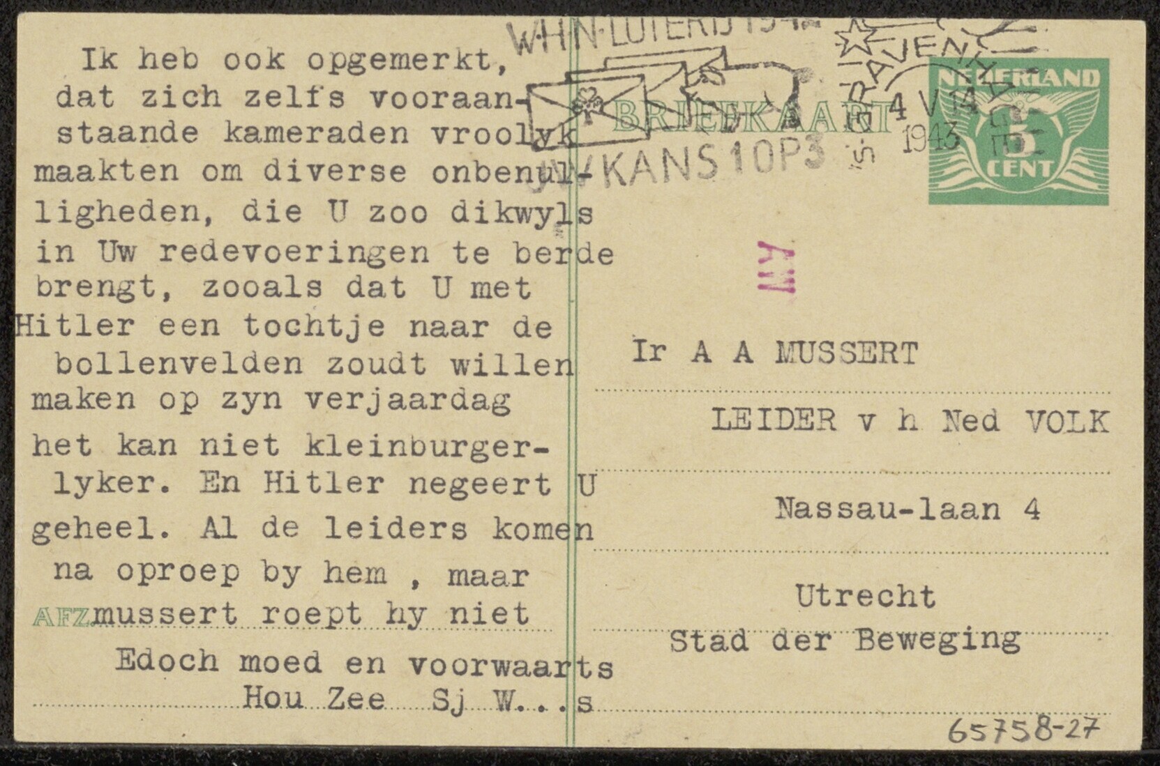 Briefkaart gericht aan Ir. A A Mussert met getypte tekst over het feit dat Hitler Mussert geheel zou negeren. Met poststempel Den Haag.