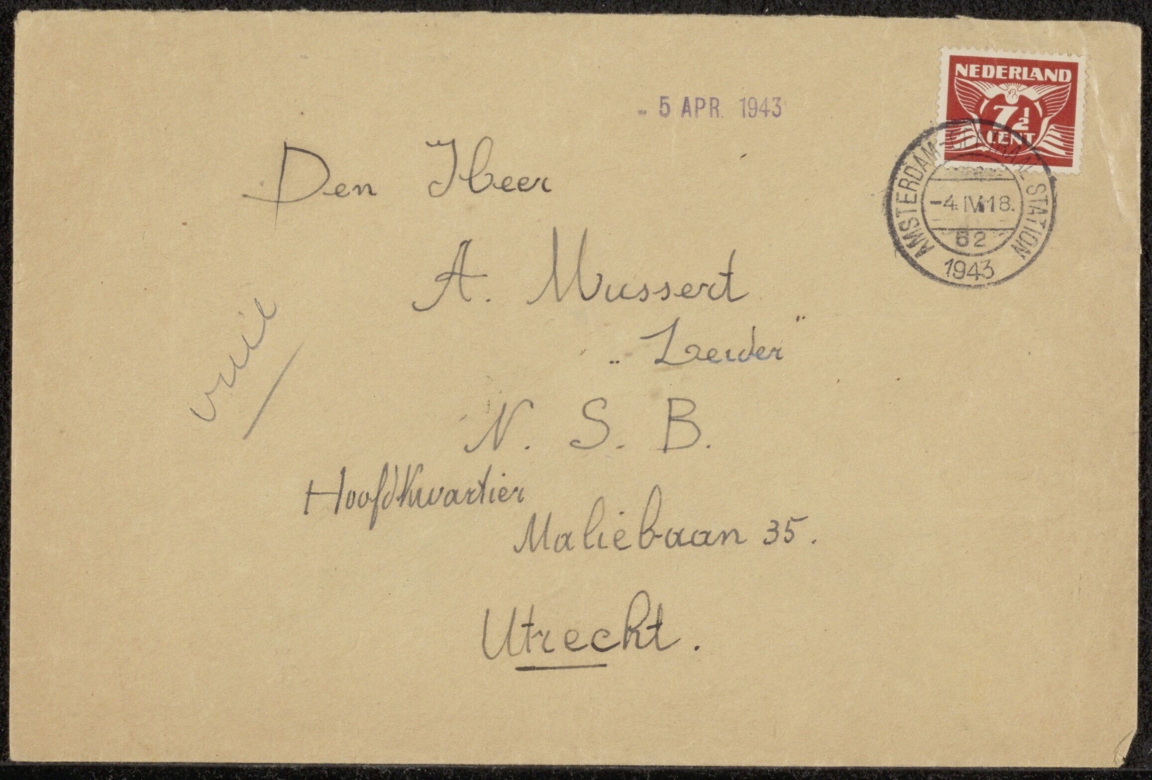 Lege enveloppe waarop staat geschreven 'Den Heer A. Mussert ‚‚Leider'' N.S.B. Hoofdkwartier Maliebaan 35 Utrecht.' Op de achterzijde staat 'Smaalders Overtoom restaurant.' Met poststempel Amsterdam.
