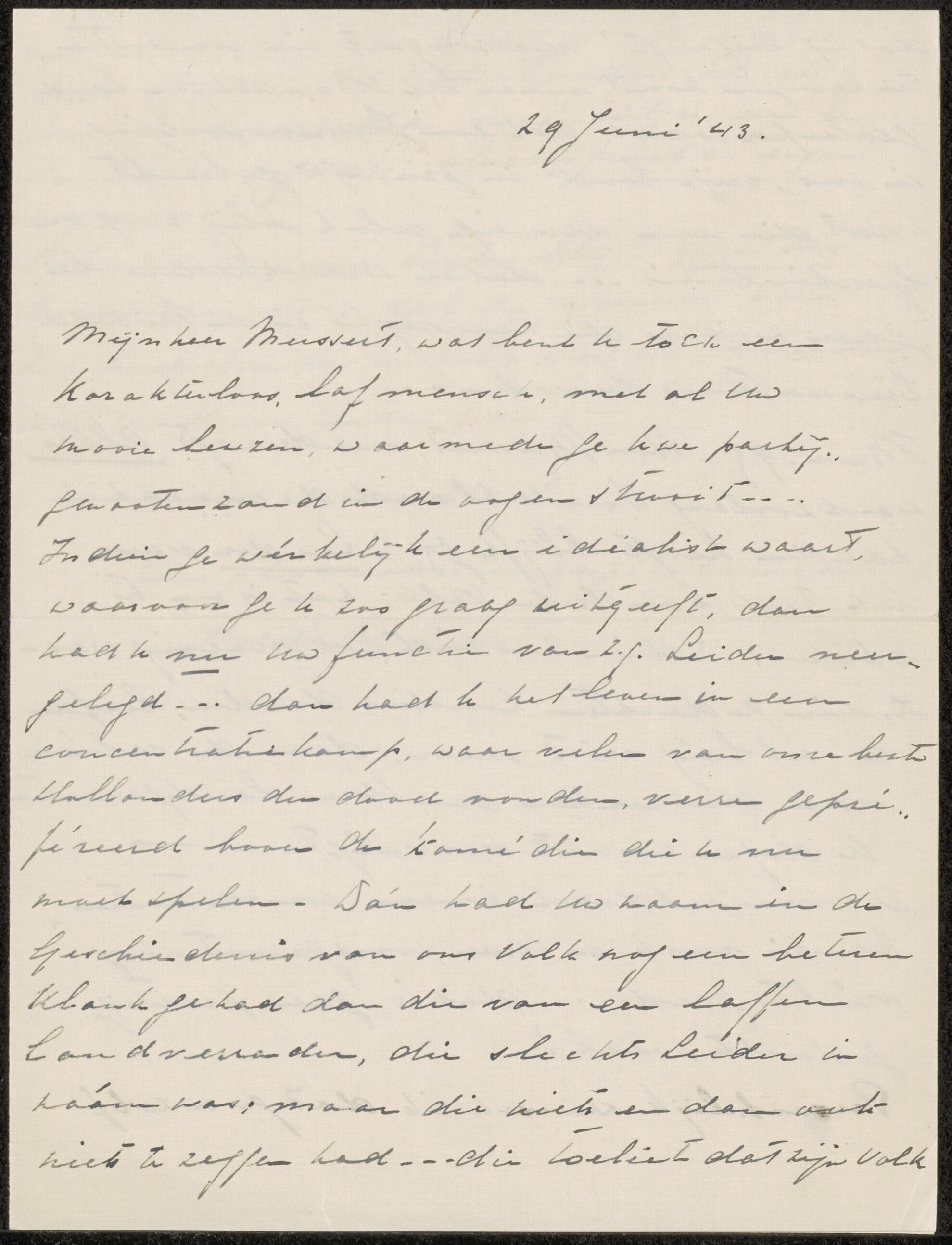 Een met pen geschreven brief over de karakterloosheid en lafheid van Mussert. Bijgaand de enveloppe gericht aan 'Den Heer A. Mussert Leider der Nat. Soc. Partij te Utrecht'. Met poststempel Amsterdam.<br><br>