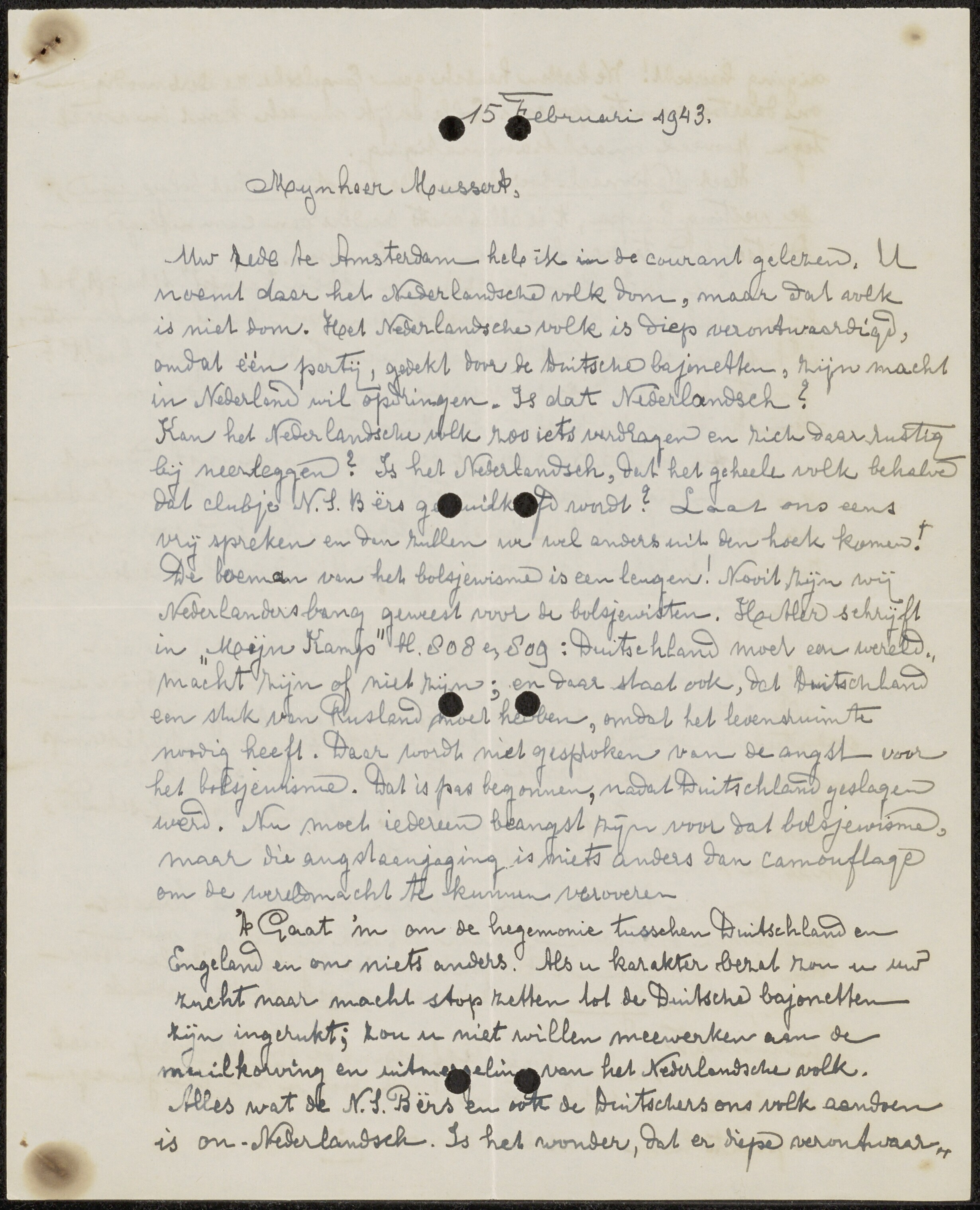 Scheldbrief van twee pagina's met enveloppe gericht aan: 'Den Weledelgestrengen Heer Ir. A. Mussert Leider van de N.S.B. in Nederland Utrecht (?)'. Poststempel Den Haag.