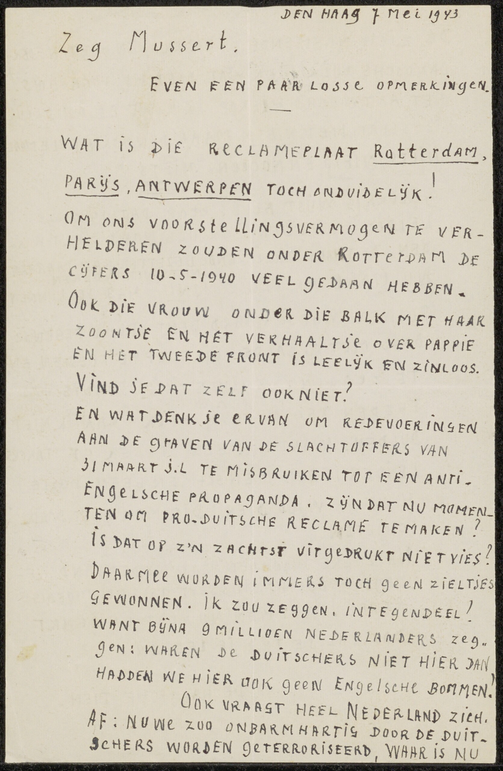 Brief met in pen geschreven tekst aan Mussert:<br>''Gelukkig wijst alles erop dat jij onze ,,leider" niet bent en ook nooit zult worden. De thans verliezende bezetter kan daaraan niet veranderen. Nu maar alleen ook nu had je kunnen toonen wat je waard bent door tegen je baas met gebalde vuist op te treden en te zeggen: zulk een misdadig optreden tegen ,,mijn volk" kan ik niet dulden, want ook een staker of stakers leider is een mensch en geen dolle hond of wil dier die men moet doodschieten.<br>Na zulke woorden zou Nederland gezegd hebben: Mussert is een moedige kerel! Wat men nu zegt en denkt dat zal de tijd je leeren. De Haagsche tien."<br>