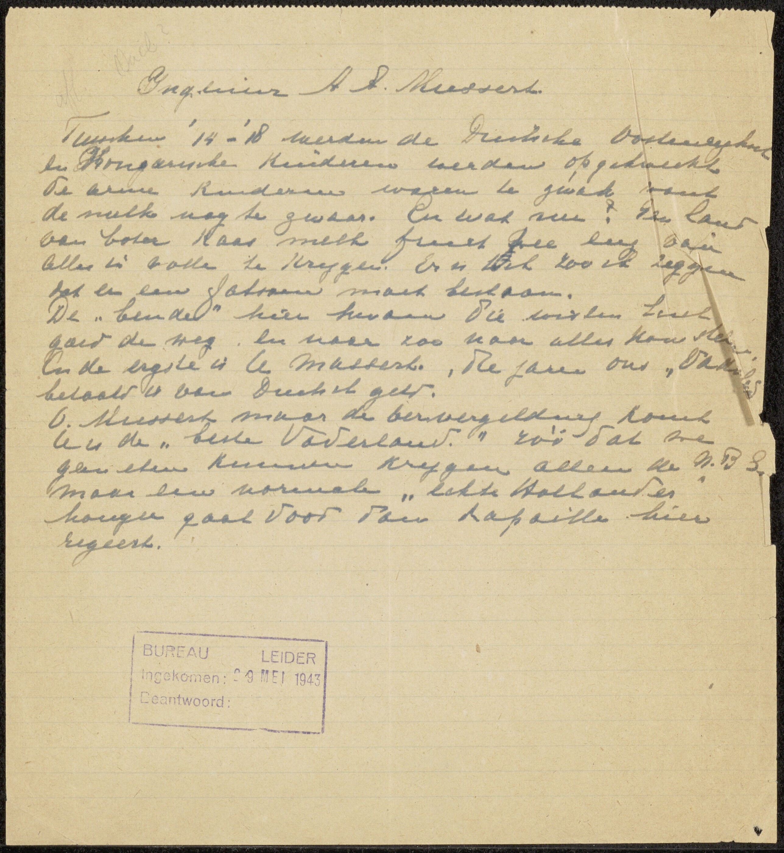 Een met pen geschreven scheldbrief aan Mussert met stempel ''Bureau Leider'' waarop de datum van de ingekomen brief: 29 mei 1943.