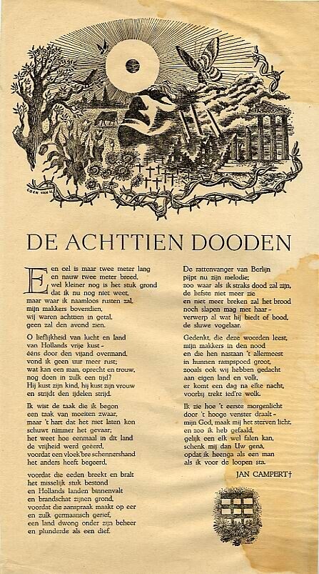 Twee uitgaven van verschillend formaat van het gedicht "'De achttien dooden" van Jan Campert. Het betreft een herdruk in de oorspronkelijke vorm.