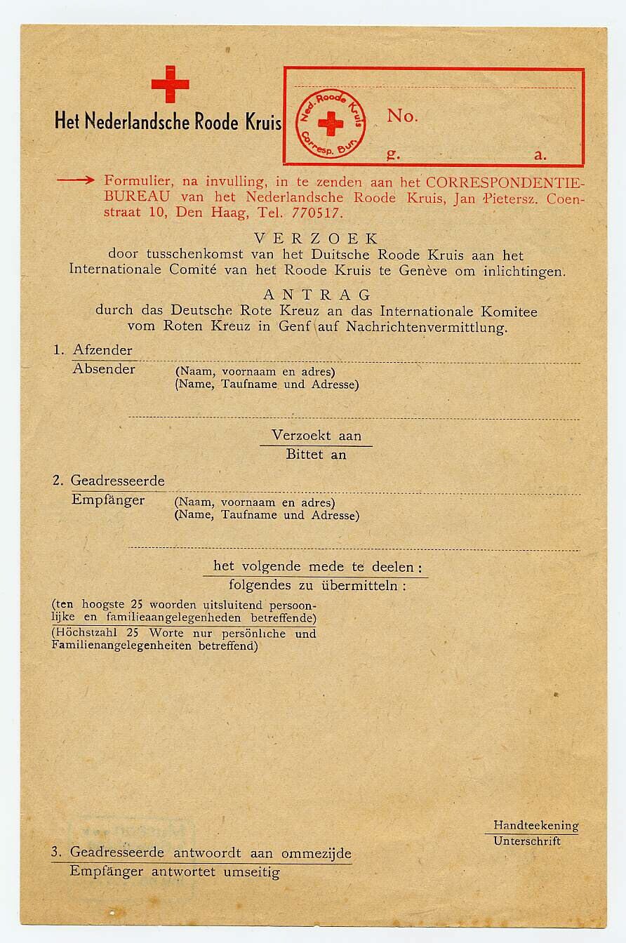 Voorgedrukt oningevuld formulier van Het Nederlandsche Roode Kruis: "Verzoek door tusschenkomst van het Duitsche Roode Kruis aan het Internationale Comité‚ van het Roode Kruis te Genève om inlichtingen".