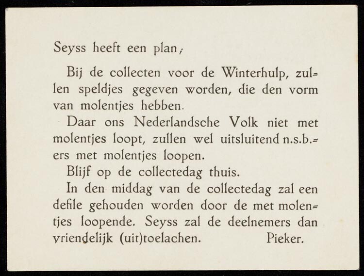 Strooibiljet met een tekst tegen de inzamelingsacties in het kader van de 'Winterhulp'.