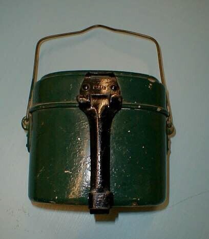 Een ovale groenblauw geverfde Duitse etensblik voor militair gebruik. Aan de voorzijde een zwart, naar de bodem scharnierend hengsel om het deksel te sluiten. Dit hengsel heeft van boven en aan de onderzijde twee beugels om een riem of band door te laten. De trommel is voor zien van een ijzeren draagbeugel.